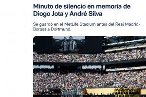 体育资讯7月6日讯 在大都会体育场举行的皇家马德里与多特蒙德的世俱杯比赛前,为纪念若塔和他的兄弟安德烈-席尔瓦,全场默哀一分钟。